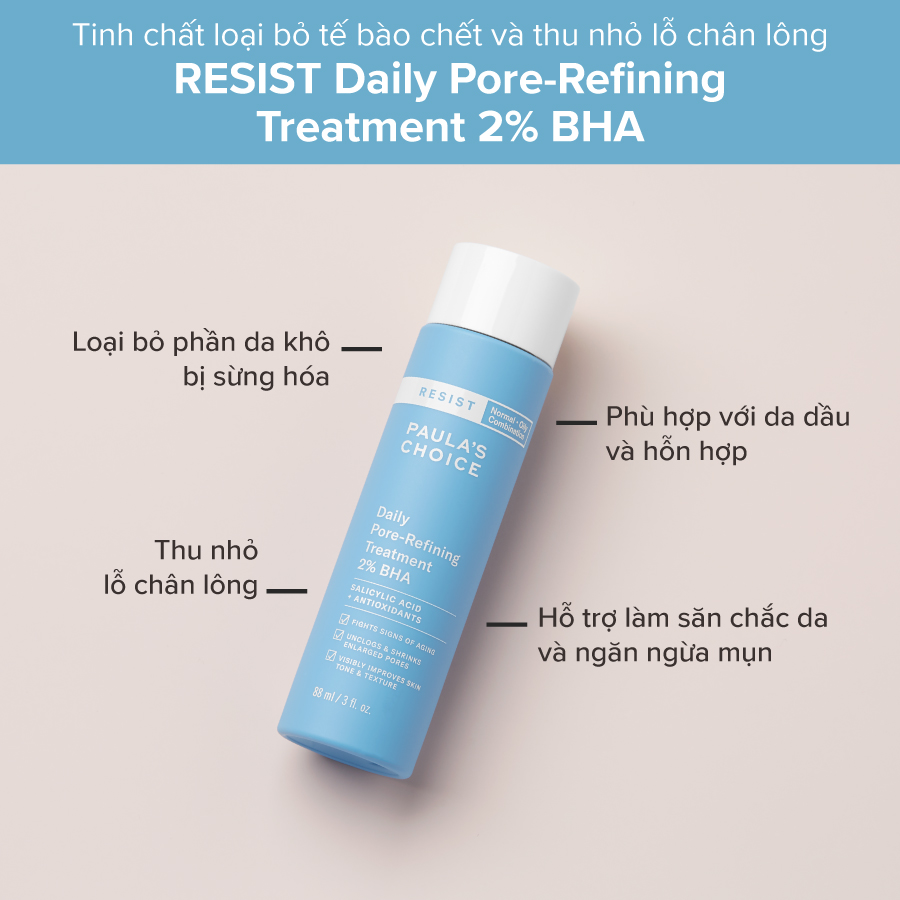 Sản phẩm loại bỏ tế bào chết RESIST Daily Pore-Refining Treatment With 2% BHA giúp loại bỏ tế bào chết trên da và làm sạch lỗ chân lông, đồng thời giảm mụn đầu đen, cải thiện các dấu hiệu lão hóa trên da.